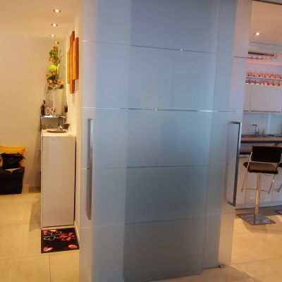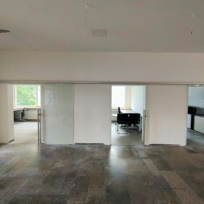 Als Raumteiler, Sichtschutz, Schiebetür, klar durchsichtig, matt, farbig, gebläselt, strukturiert – nichts muss, alles kann.