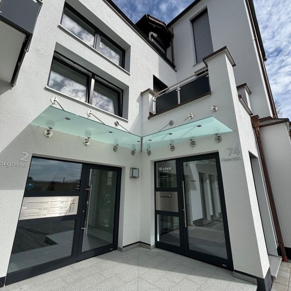 Vordächer aus Glas sind vor allem witterungsbeständig. Sie halten den Regen ab und lassen das Tageslicht durch. Glas-Vordächer integrieren sich harmonisch in das Gesamtbild der Fassade und setzen elegante Akzente.